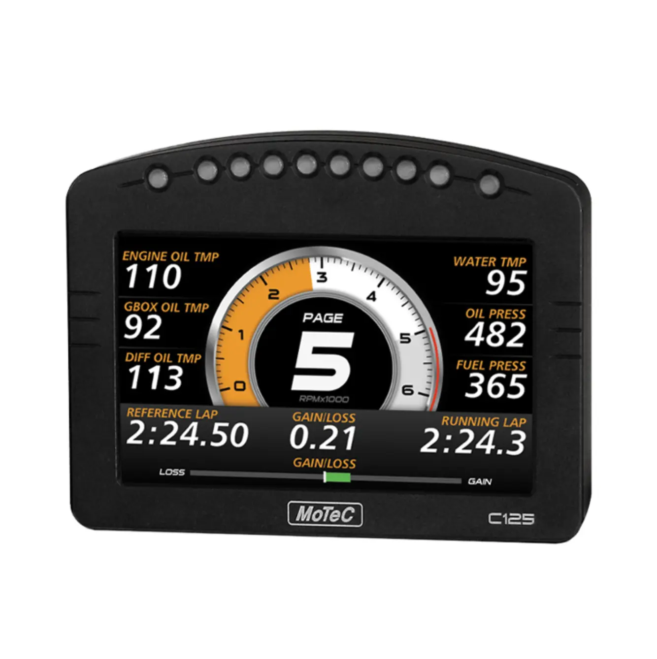 The C125 also features ten full color LEDs integrated into the unit for use as shift lights, warning lights or other driver alerts. The color, function and intensity of each LED is programmable, allowing users to develop their own unique strategies and sequences.